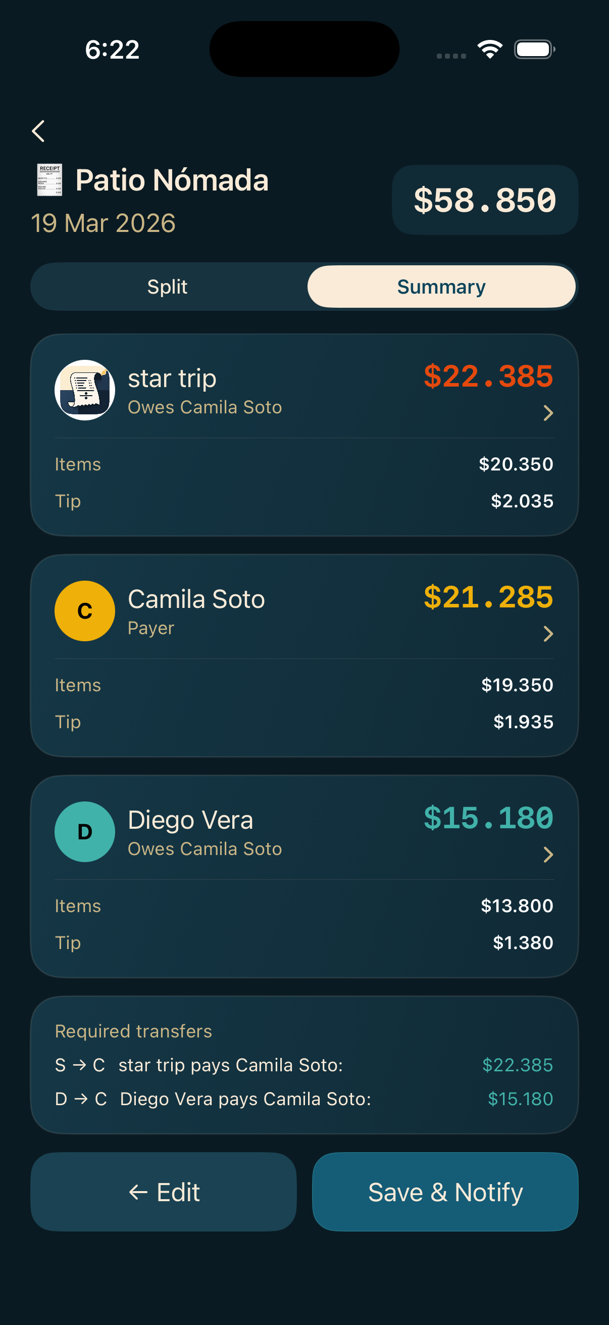 La app calcula impuestos y propina proporcionalmente y muestra cuánto debe transferir cada participante.